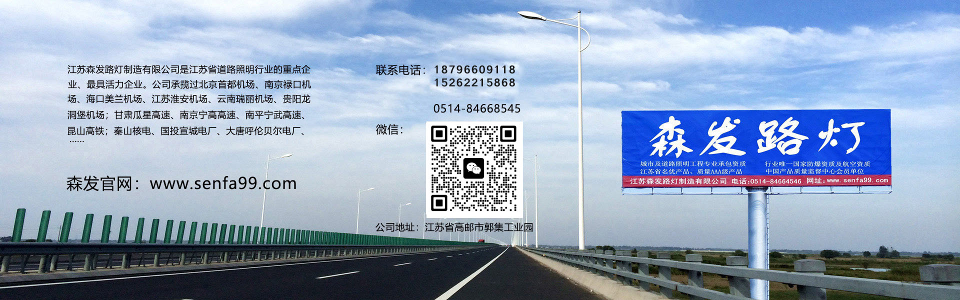 江蘇森發路燈制造有限公司是江蘇省道路照明行業的重 點企業。公司承攬過北京首都機場、南京祿口機場、?诿捞m機場、江蘇淮安機場、云南瑞麗機場、貴陽龍洞堡機場、珠海金灣機場、贛州黃金機場、江蘇新沂機場;甘肅瓜星高速、南京寧高高速、南平寧武高速、福建韶光高速、天津薊汕高速、貴州安江高速、昆山高鐵;秦山核電、福建霞浦核電、國投宣城電廠、大唐呼倫貝爾電廠、大唐803電廠、邵陽寶慶電廠、蘇州望電電廠、安徽廬江電廠、長治王曲電廠、國電湖北漢川電廠;福建莆田港、山東蓬萊港、江蘇太倉港、唐山曹妃甸港;福建武夷山風景區、江蘇吳江東太湖風景區;塔里木油田油罐區、青海鹽湖集團、北京工業大學、武漢通用制造基地、黑龍江濃江農場、江西星火有機硅項目;及國內眾多城市道路亮化項目。